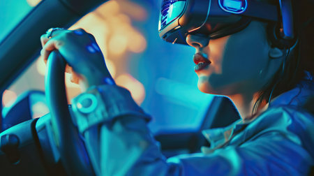 Stylish woman in the VR googles, holding steering wheel and driving a car