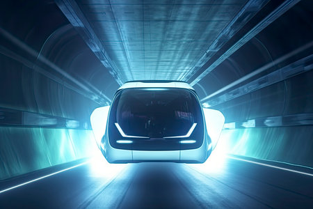 futuristic flying bus with peoples fast driving in sci fi tunnel, coridor. Concept of future. 3d rendering.Generate Ai