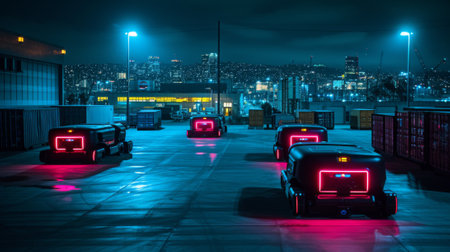 A row of robotic vehicles with neon lights on them in a parking lot, AI