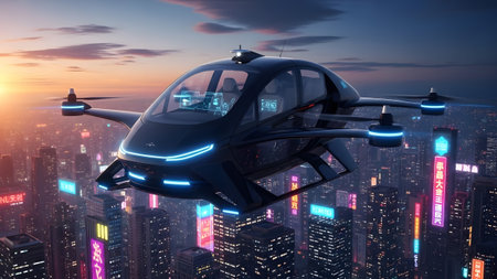 Futuristic autonomous flying vehicle soaring above a neon-lit metropolis at dusk