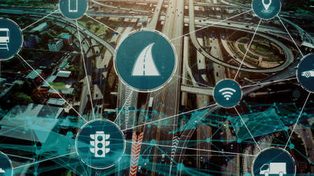 Smart transport technology concept for future car traffic on road . Virtual intelligent system makes digital information analysis to connect data of vehicle on city street . Futuristic innovation .