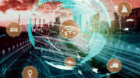 Fast motion transport flow on road with global network graphic modernization showing concept of future smart transportation , disruptive innovation and agile business methodology .