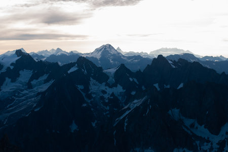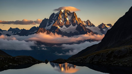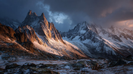This stunning photograph captures a dramatic mountain landscape at dusk, showcasing snow-covered peaks and dynamic skies. A perfect representation of untouched nature.