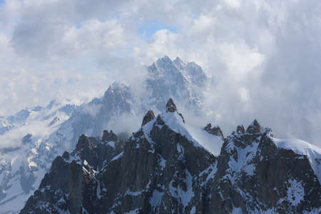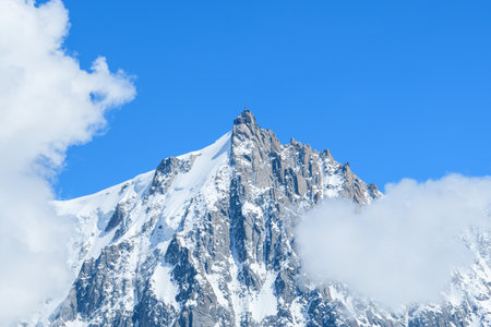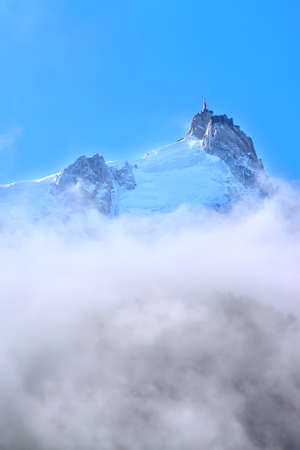 Aiguille du Midi peak between clouds, mountain in the Mont Blanc massif in the French Alps, Chamonix, France