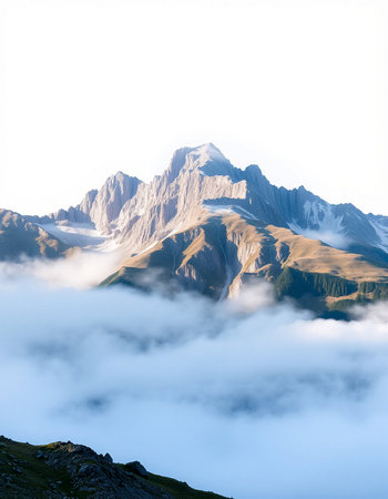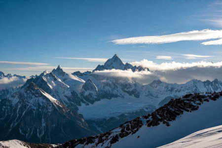 Magnificent scenery at the top of the snow-capped mountains, wonders of the snow-capped mountains shrouded in clouds