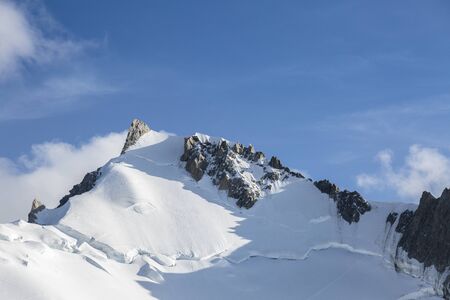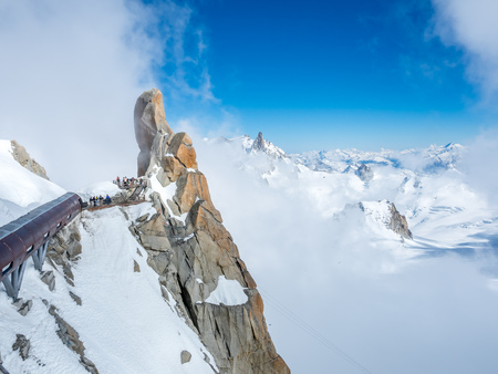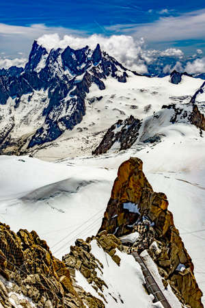Viewpoint around top of Mont Blanc mountain peak, highest peak of Europe, in Chamoix Mont-Blanc town, with freeze snow view and cold climate, in France