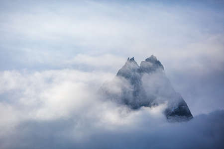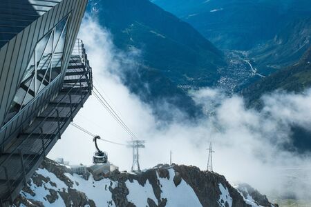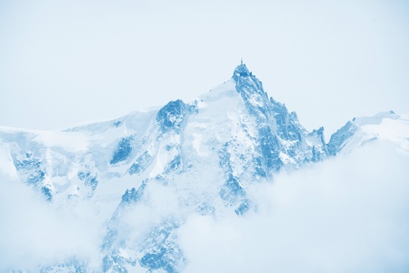 Aiguille du Midi in the fog and clouds in the French Alps, Chamonix Mont-Blanc, France