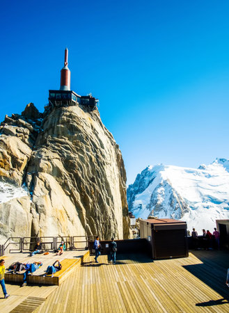 Shamoni Rrance - 25 August 2019: Mountain top station of Aiguille du Midi view from terrace with tourists