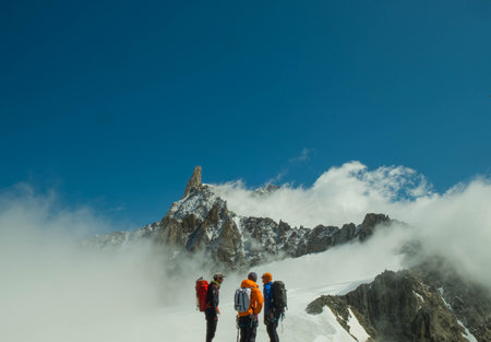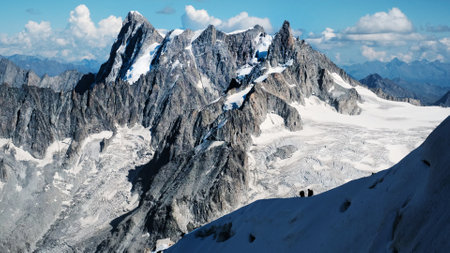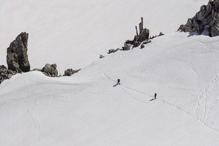 men alone in the most difficult mountains to face nature. Mont Blanc at Punta Hell Bronner in the Aosta Valley in the summer of 2023