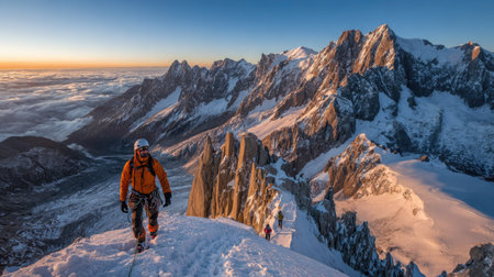 Group of climbers in the rays of the sun in the concept of active extreme sports on the mountain. Hiking climbing adventure travel. AI generated.