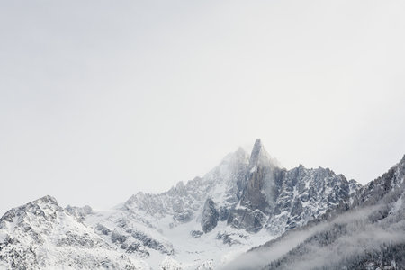 Foggy view of ridge of European Alps in winter, ski resort Chamonix Mont-Blanc, France. Ideal place for extreme sport and hiking. Winter activity. Natural background