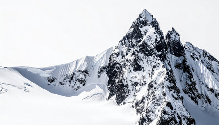 Aerial view of snow capped mountain peak featuring climbers and dramatic shadows in natural light