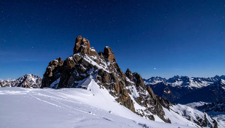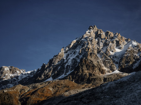 Majestic aiguille du midi peak Mont Blanc dominating the autumnal landscape of chamonix valley, French alps