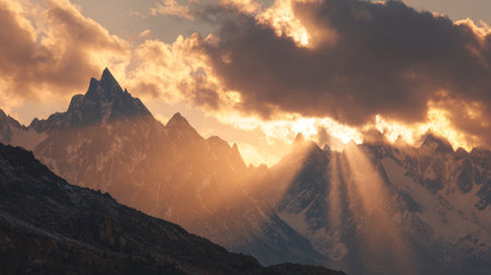 Experience the breathtaking beauty of a sunrise illuminating rugged mountain peaks, as dramatic clouds enhance the serene atmosphere of this natural landscape.
