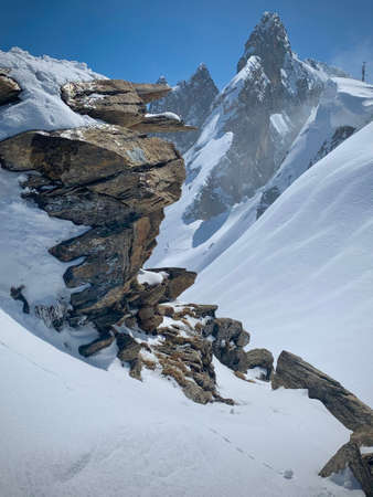 A snowfield and rock formations in the Mont Blanc area. Alps.