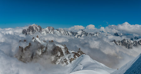 Panorama from the Aiguille du Midi with clouds in amongst the mountains