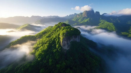 Stunning aerial shot of a vibrant mountain range covered in dense green vegetation, with a layer of fog and the warm glow of the morning sun.