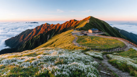 Expansive view of a grassy mountain ridge dotted with flowers and a small hut, surrounded by peaks and a vast sea of clouds under warm sunrise light