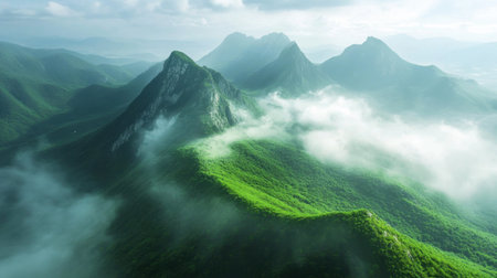 Explore the breathtaking beauty of a lush green mountain range shrouded in mist, capturing the essence of tranquility and the grandeur of nature from an aerial perspective.
