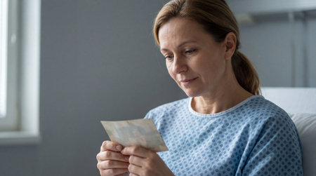 Woman in hospital gown sitting on bed thoughtfully looking at old photograph, reflecting on memories during quiet moment of recovery.