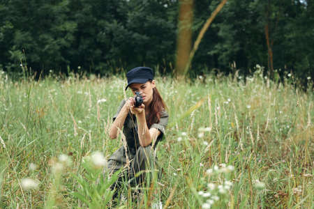 Woman with a weapon aiming forward on squats on outdoor green leaves