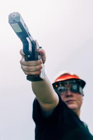 Experienced woman shooter holding a pistol with both hands