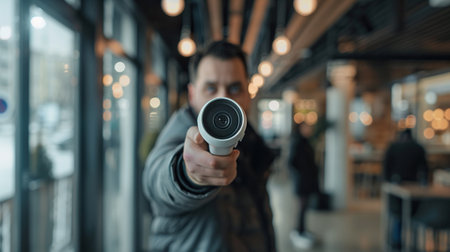 a man holding a surveillance camera in his hand, against an office background
