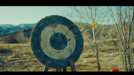 Outdoor scene featuring a target with an arrow lodged in its bullseye, highlighting the focus and determination required in archery amidst a serene natural backdrop.