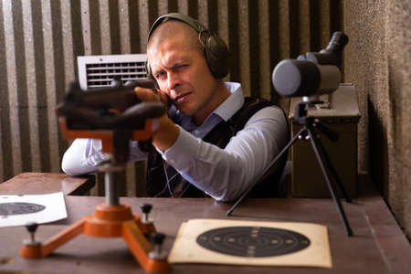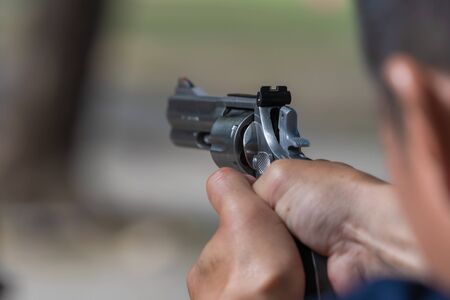 Man with hand gun aiming at shooting range and releasing stress. Selective Focus
