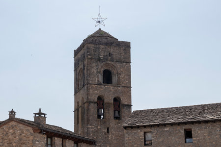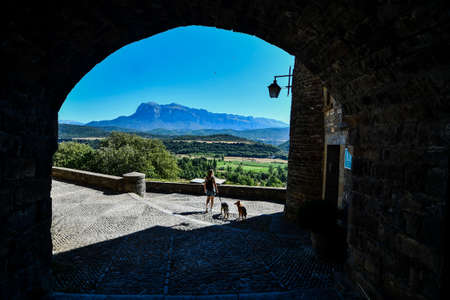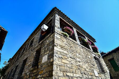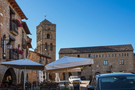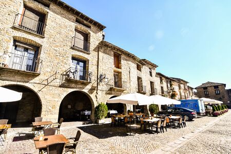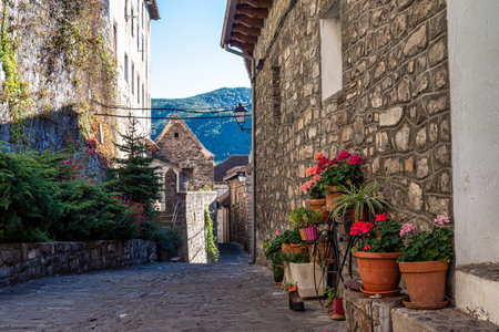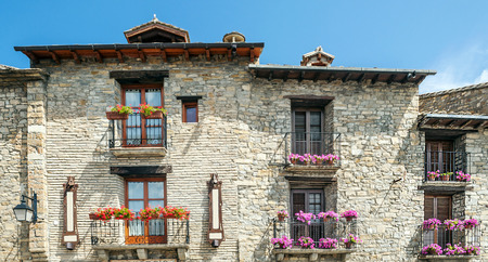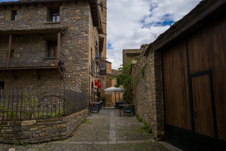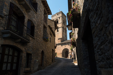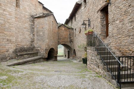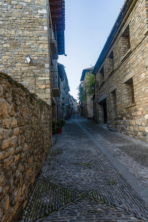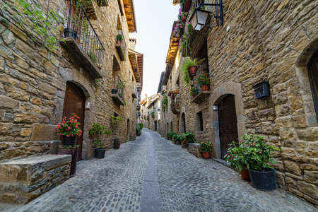 Street with stone houses in the medieval village of Ainsa in the pyrenees, Aragon, Spain
