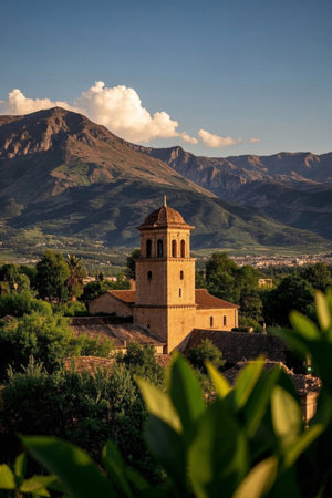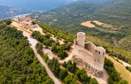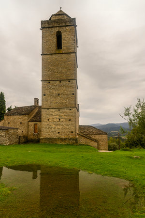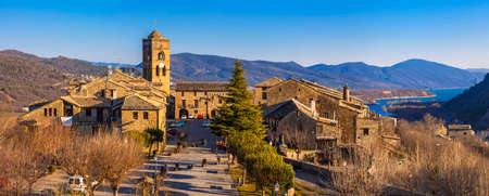 Small village in the Vall Fosca, Catalonia, Pyrenees. Historical heritage of the Vall Fosca. Unknown tourism. Escaping mass tourism. Golden evening hour. Copy space.
