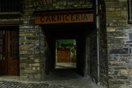Hecho, Spain - Oct 23, 2022: Beautiful village Hecho in the Hecho valley in the pyrenees mountains Huesca Spain Europe