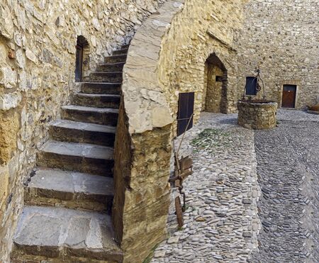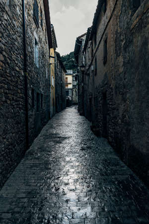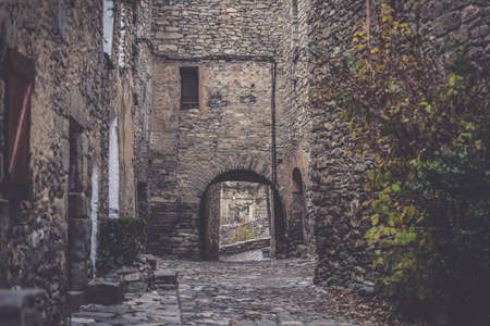 Narrow street with typical houses of the rustic village of Peratallada, Girona, Catalonia, Spain