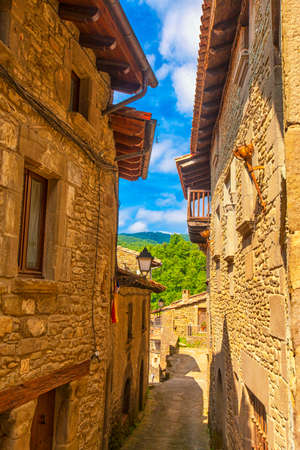 Medieval architecture stone rock buildings flower Senyera flag in charming narrow cobblestone street alley quaint historic old town village of Rupit i Pruit, Osona Collsacabra Catalonia Spain Europe
