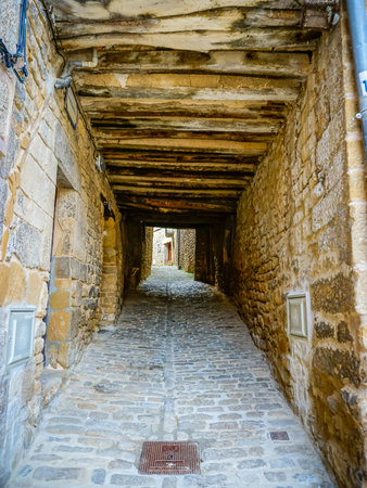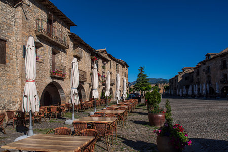 Picturesque cobblestone street lined with historic stone buildings in the medieval village of Ainsa, Spain.