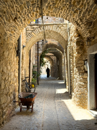 Chios Island, Greece. Mesta medieval village, Narrow alley, stone walls, cobblestone pavement and stone arch. Traditional architecture