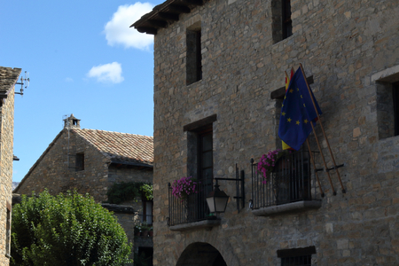 The stone made town hall with the European, Spanish and Aragonese flags in the medieval rural town Ainsa, located in the Spanish Pyrenees mountains