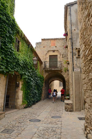 Peratallada, Spain - July 25, 2017: People passing by passageway at cobbled street of the medieval village of Peratallada, located in the middle of the Emporda region of Girona, Catalonia, Spain.