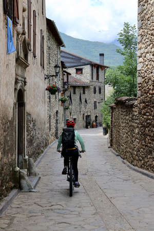 Detail of healthy woman riding her bike through the stone houses and woods of Anciles, a village nearby Benasque, one of the most amazing spots of the Spanish Pyrenees mountains.