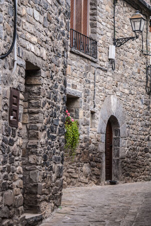 Street of an old medieval town with stone houses and cobbled floors, street lamps and an atmosphere of bygone times. AÃnsa, Spain.