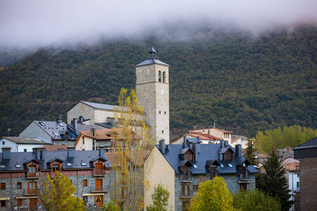 Biescas village in Huesca Aragon Pyrenees of Spain in foggy morning