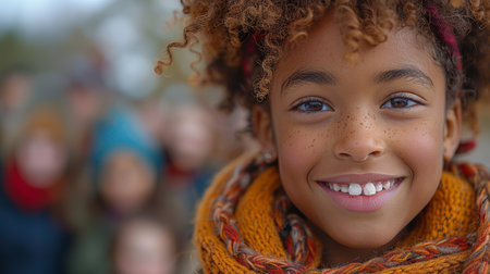 Diverse group of friends smiling together outdoors, dressed in cozy winter attire, capturing a moment of joy and connection in a lively and cheerful setting
