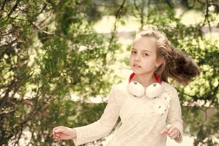 Kid dancer with long flying hair. Girl dance to music in summer park. Small child enjoy music in headphones outdoor. Melody sound and mp3. Summer fun and joy