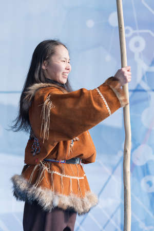 Aboriginal female emotion dancing with spear in national clothes indigenous people. Concert of Kamchatka State Academic Koryak National Dance Ensemble Mengo. Kamchatka Peninsula, Russia - Feb 21, 2019