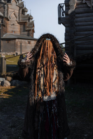 Shamanic dances, a shaman woman in a folk costume with lots of fringes and ribbons, in a village among wooden architecture, Slavic or Nordic style
