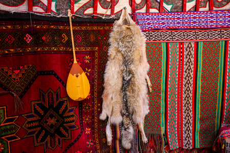 Interior decoration of a Kazakh yurt. The decoration of the yurt consists of objects and products created by home crafts in various regions of Kazakhstan.