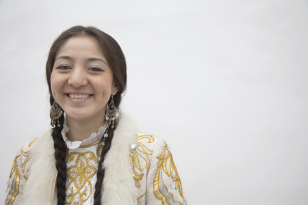 Portrait of young smiling woman with braids in traditional clothing from Kazakhstan, studio shot