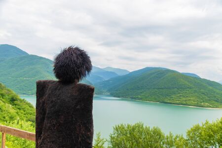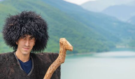 Georgian man in a beech costume on a background of mountains. Selective focus.