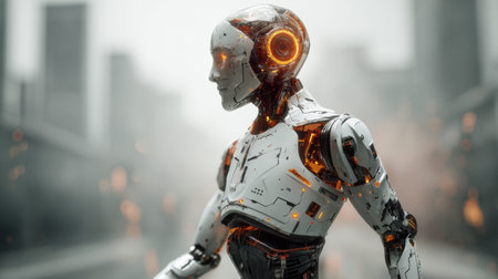 This image features a futuristic humanoid robot with glowing components, set against an urban backdrop, illustrating the intersection of technology and modern innovation.