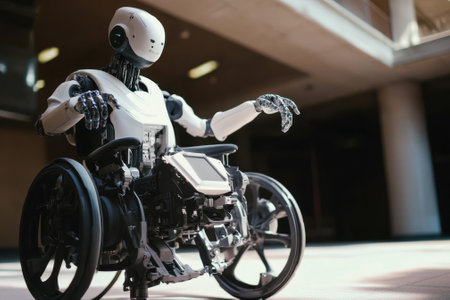 A robotic wheelchair sits in a modern building, illustrating advancements in assistive technology and mobility.